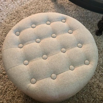 Very nice ottoman. Love the color and fabric. The legs must be screwed in by the purchaser. I had a hard time screwing the legs in so they were all aligned the same direction. The fabric on the bottom of the ottoman tore when I tried to screw one of the legs in.