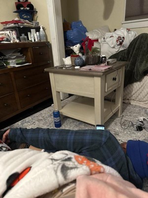 Whether your style is farmhouse fresh, shabby chic or country cottage, you'll find this end table dressed to impress. Its two-tone, gently distressed finish pairs weathered oak with antique white for that much more quaint character. Charming elements include a plank-and-frame style top, black faceted hardware and a smooth-gliding drawer for remote controls and more.