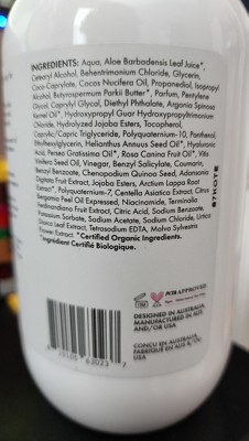 aqua, aloe barbadensis leaf juice*, cetearyl alcohol, behentrimonium chloride, glycerin, coco-caprylate, cocos nucifera oil, propanediol, isopropyl alcohol, butyrospermum parkii butter*, parfum, pentylene glycol, caprylyl glycol, diethyl phthalate, argania spinosa kernel oil*, hydroxypropyl guar hydroxypropyltrimonium chloride, hydrolyzed jojoba esters, tocopherol, caprylic/capric triglyceride, polyquaternium-10, panthenol, ethylhexylglycerin, helianthus annuus seed oil*, hyaluronic acid, persea gratissima oil*, rosa canina fruit oil*, vitis vinifera seed oil, vinegar, benzyl salicylate, coumarin, benzyl benzoate, chenopodium quinoa seed, adansonia digitata fruit extract, jojoba esters, arctium lappa root extract*, polyquaternium-7, centella asiatica extract, citrus bergamia peel oil expressed, niacinamide, terminalia ferdinandiana fruit extract, citric acid, sodium benzoate, potassium sorbate, sodium acetate, sodium chloride, urtica dioica leaf extract, tetrasodium edta, malva sylvestris flower extract.' '[*certified organic ingredients.]
