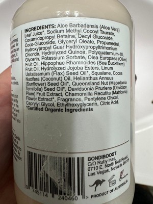 aqua, sodium methyl cocoyl taurate, cocamidopropyl betaine, sodium chloride, decyl glucoside, coco-glucoside, glyceryl oleate, coconut acid, glycerin, parfum, propanediol, pentylene glycol, caprylyl glycol, potassium sorbate, olea europaea fruit oil*, chenopodium quinoa seed, linalool, diethyl phthalate, phenethyl alcohol, aloe barbadensis leaf juice*, ethylhexylglycerin, polyquaternium-10, sodium benzoate, hydrolyzed jojoba esters, helianthus annuus seed oil*, cocamidopropyl dimethylamine, hippophae rhamnoides kernel extract*, benzyl salicylate, citronellol, 4-tert-butylcyclohexyl acetate, hydroxypropyl guar hydroxypropyltrimonium chloride, jojoba esters, cocos nucifera oil, linum usitatissimum seed oil*, macadamia integrifolia seed oil*, squalane, methylenedioxyphenyl methylpropanal, sodium acetate, isopropyl alcohol, davidsonia jerseyana fruit extract, tetrasodium edta, chamomilla recutita flower extract, citric acid, alcohol denat., chloroacetic acid.' '[*certified organic ingredients.]