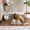 Enhance your pets dining experience with the Bone Dry Pet Food Mat. Measuring 12x18 inches, this ultra-absorbent mat is designed to handle spills and splashes, keeping your floors clean and dry. Crafted from microfiber, it is both durable and easy to care for. Simply wash in cold water and lay flat to dry. The non-slip back surface ensures the mat stays in place, while its stylish designs add a touch of fun to your pet's dining area. Available in various sizes and patterns, this mat combines practicality with a fashionable flair.