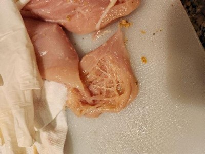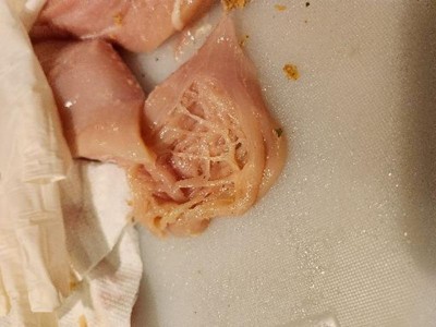 I found part very stringy, i dont know why or what is the cause. I bought it and I never froze it I used it the next day. Only used 2 out of the 3, had to toss that one
