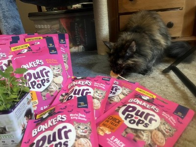 Guests are thrilled with the Bonkers Purr Pops, noting their cats' excitement and enjoyment of the salmon flavor. The unique lollipop design adds a fun twist to treat time, making it a delightful experience for both cats and their owners. Many appreciate the high-quality ingredients and the convenience of individually wrapped treats. However, some guests mentioned that their cats preferred to chew rather than lick, and a few suggested expanding the flavor variety.