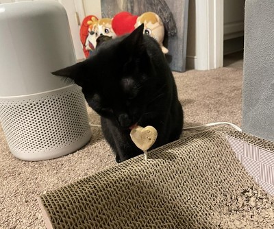 Our family cat, named Chester, has allergies and does not get to enjoy regular treats as other cats do. With this being said, he loves the Purrpops. He can only have the fish-based ones. When he eats the Purrpops, his face lights up and is so adorable. We wanted to share the photo with you so that you can enjoy it and know that cats love your products. Please let me know if you need the photo for marketing purposes :).