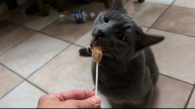 My cat are crazy about I, no time to lick it. He bites it right away P.S. Can't upload 36 second video. Have to take screenshots, sorry