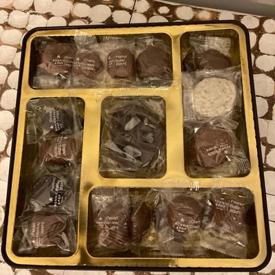 Indulge in more than two delicious pounds of assorted truffles. Including Belgian Pretzels and Grahams. Chocolate peanut clusters, milk chocolate almond clusters, white chocolate butter pecan clusters, chocolate peanut butter square, chocolate peppermint parties, white chocolate pretzel clouds, pecan snappers, dark chocolate haystacks, sea salt caramels, double dark silk shells, English Toffees, pecan melt aways.
