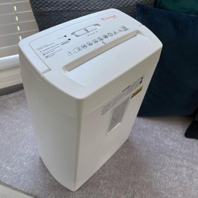 [This review was collected as part of a promotion.] Great shredder! Keeps all the pieces in the container and doesn’t create dust! The sound wasn’t as loud as others I’ve tried which is a huge plus. It handles a few sheets at a time well. The unit is attractive in the bright white color and fits in easily in my kitchen where I handle all my mail. Very convenient and I’m happy with the purchase. The size is great and the weight is light enough to move around as needed. I received an incentive to write this review.
