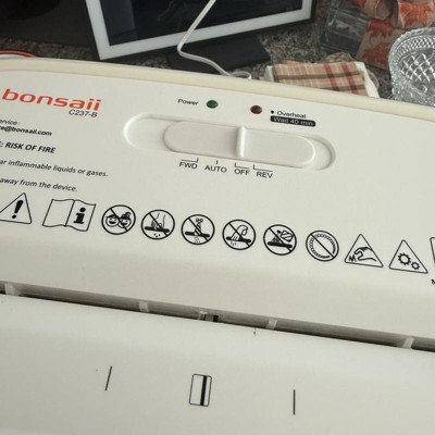 [This review was collected as part of a promotion.] This shredder is compact and very lightweight. It had a strong plastic smell when I pulled it out of the packaging, but after a short time it didn’t seem as potent. There are several features available for shredding, automatic (where it starts as soon as you feed it paper), forward and reverse that run full time and off. It has an overheating indicator which I appreciate and seems like it works well with what I tested. I received an incentive to write this review.