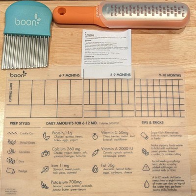 [This review was collected as part of a promotion.] Perfect kit for preparing baby's finger foods! This DIVVY Solids Starter kit by Boon is wonderful with helpful tips for age appropriate sizes. The mat is nonslip on the back. I love how the crinkle cutter and the shredder fit with a good grip in your hands.