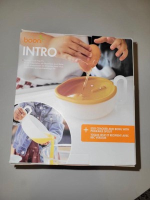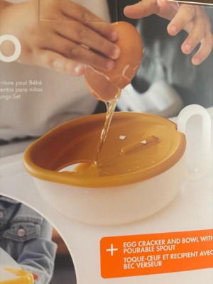 - Get Cracking: Egg cracker features a top that lets eggs slide into the cup with a pourable spout for easy additions to the mixing bowl
