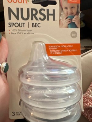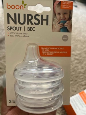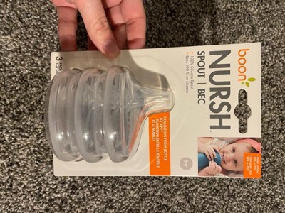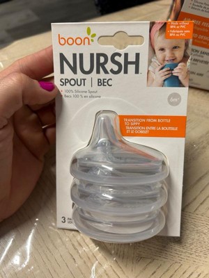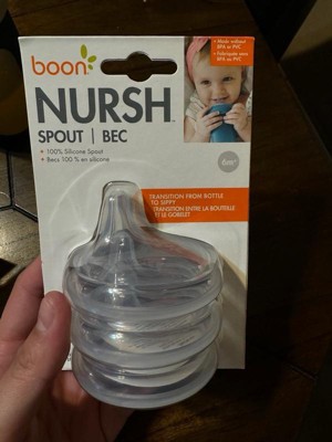 [This review was collected as part of a promotion.] The Boon Nursh Spout transitional sippy lids are nice! The spouts are made from 100% silicone. It’s great to be able to continue to use the bottles too.
