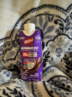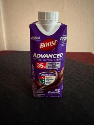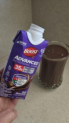 [This review was collected as part of a promotion.] Boost Advanced Nutritional Drink in Rich Chocolate is a great way to get in extra protein or even for a snack or dessert. They are great with individual servings. It was a little thick,but not too thick. I like that it had a cap on it so if you didn't want to drink all of it at once you can put the cap back on it and pop it back in the refrigerator.