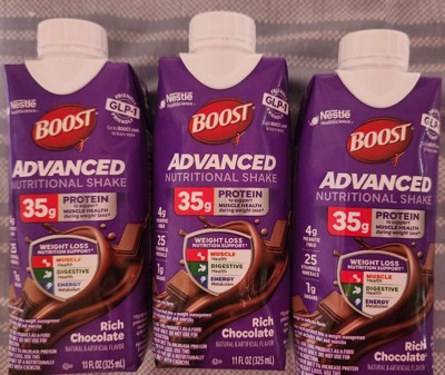 [This review was collected as part of a promotion.] I received an advanced nutritional Chocolate Boost drink from Influenster in exchange for my honest review. I received three count of the meal supplement in an 11 ounce size carton. The drink has a rich chocolate taste. Great for mornings in place of breakfast. The drink kept me full for a few hours if I drank mid morning. There is no after taste, and the drink didn't upset my stomach. This drink provides 35 grams of protein, so I feel good about drinking this supplement.