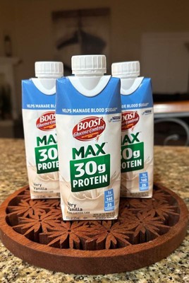 - Four 11 fl oz BOOST Glucose Control Max 30g Protein Very Vanilla Nutritional Drinks