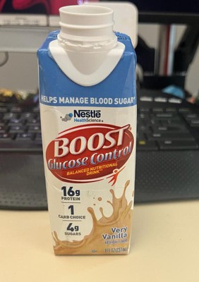 BOOST Glucose Control Very Vanilla Flavored Nutritional Drink is a balanced nutritional drink specially formulated to help people with diabetes manage blood sugar as part of a balanced diet.† This vanilla drink provides 25 vitamins and minerals and 16 grams of protein per serving that help to maintain muscle. With 16 grams of carbohydrates (1 Carb Choice) per bottle, this is a great choice if you're managing your carb intake. BOOST Glucose Control Very Vanilla Nutritional Drinks have a delicious taste. This pack of nutritional shakes includes six reclosable 8 fluid ounce cartons. †BOOST Glucose Control® Nutritional Drink is specially designed with a unique blend of protein, carbs and fat to help people with diabetes manage blood sugar levels as part of a balanced diet. NOT A SUBSTITUTE FOR MEDICATION.