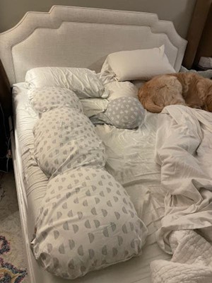 [This review was collected as part of a promotion.] I received this pillow as a participant in The Stellar Product Testing Panel at 33 weeks pregnant . Upon first impression the pillow has a soft cover, good fill, and decent size. The size is more manageable than other U shaped pillows I’ve used in the past that tend to fall off the bed on one side. The pillow does keep you in a side sleeping position and I appreciate the side pillow has some flexibility to either support your bump or your back depending on which side you’re laying. After trying it in a few configurations, I liked the curve side down by my feet the most to offer hip support between my legs. It’s very comfortable to sleep with and my only gripe is the filling gets a bit compressed where I place it between my legs. As a c-section Momma, I can see using the pillow during recovery from my surgery and creating a buffer between my incision site while holding baby. Bonus points, my toddler loves it too and enjoys curling up in it!