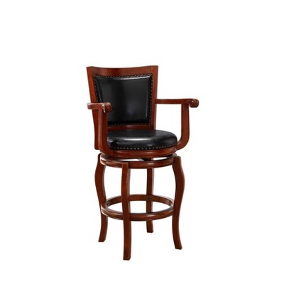 Finish off your bar, den, or game room in traditional style with the Broadmoor Swivel Stool. The Broadmoor Swivel Stool is designed to be enjoyed, which is why it features easy-wipe faux leather upholstery. If your drink spills or some crumbs fall onto the faux leather seat, simply wipe the upholstery clean in a flash. For your comfort, it also features a swivel, built-in footrest, and padded seat and backrests. The counter stool’s solid rubberwood frame comes in your choice of Cherry, Cappuccino, Walnut or Black finishes. The protective floor glides on the base guard your hard floors against scratches or scuffs. The Broadmoor is available in counter, bar, and extra tall height options.