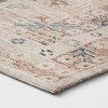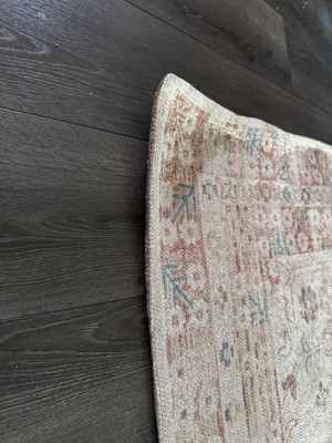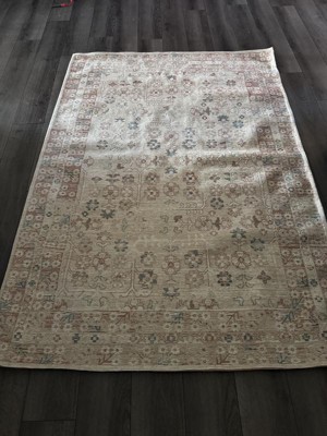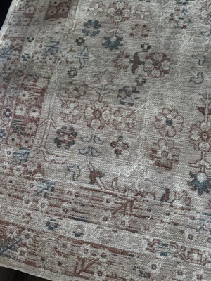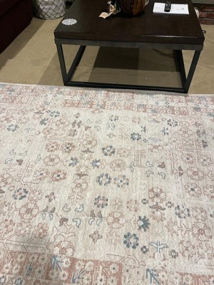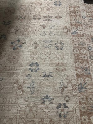 A: Hello Paige - Thank you for your interest on - 5'x7' Border Flower Area Rug. The Rug includes warm shades such as rust / terracotta / burnt orange, muted green, cream / ivory, and touches of pink. Hope this information helps. Happy shopping! - Rose