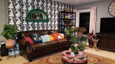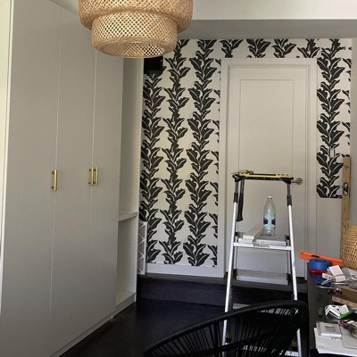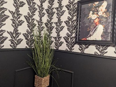 A: The wallpaper features a black and white leaf-print design with a garden-inspired charm.