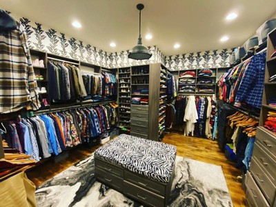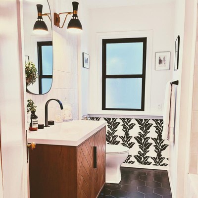 - Black and white leaf-print wallpaper adds a simple yet statement-making look
