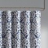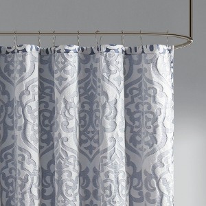 Add a touch of class to your bathroom with our Madison Park Odette Jacquard Shower Curtain. This luxurious textured shower curtain flaunts a gorgeous silver damask medallion design on a stria navy jacquard ground that adds rich texture and dimension to the lavish look. Measuring 72x72", each shower curtain is finished with 12 button holes on top making it easy to assemble hooks and hang onto rod (hooks and rod not included). To better preserve this beautiful shower curtain, a water repellant liner is highly recommended and can be purchased separately (liner not included). Machine washable for easy care; complete the collection with coordinate matching bedding, alas available and sold separately.