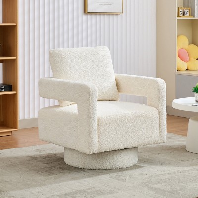 Boucle Fabric Upholstery Solid Wood Swivel Modern Accent Chair with Foam Seat, Attached Cushions and 360-Degree Swivel