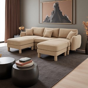 Boucle U-Shaped Sectional Sofa with Shell Armrests & 2 Ottomans