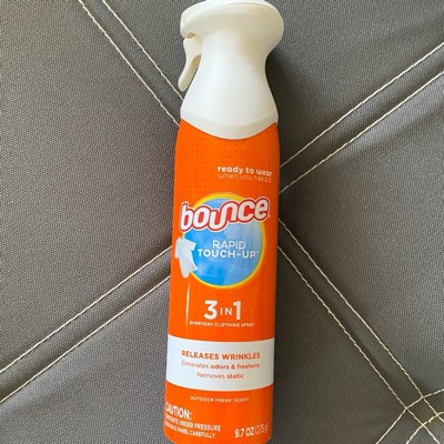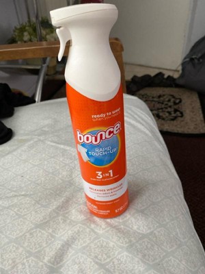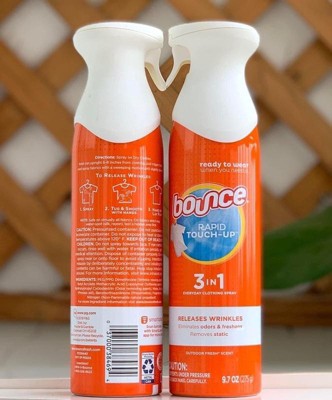- Forget about ironing! This dewrinkle spray for clothes lets you spray, smooth, and see static and wrinkles vanish in seconds. Ideal for busy mornings or quick touch-ups, just spray Bounce 3-in-1 Anti Static Spray on dry fabric, smooth out, and hang or lay flat for static-free, wrinkle-free results.