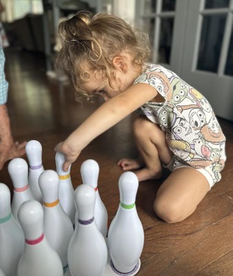 This is the cutest bowling set, with plenty learning opportunities because of the number on the pins. When the pins are knocked over they do not make a lot of noise .This is perfect for young children.