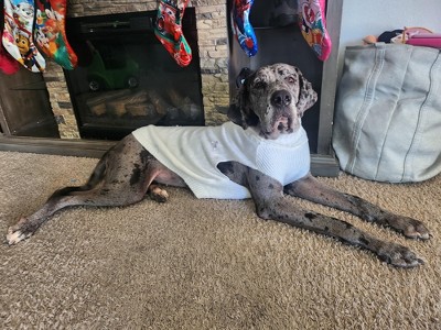 Ordered a large according to the measurements for my lab/plott hound mix. It fits great and looks adorable on her!
