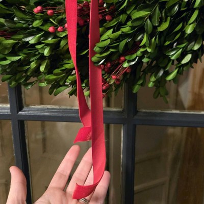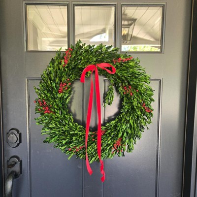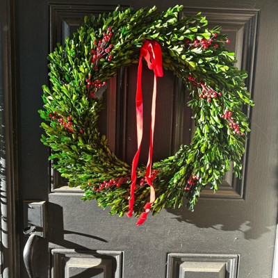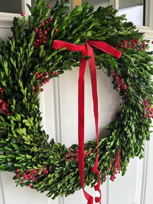 [This review was collected as part of a promotion.] This wreath is absolutely beautiful and brings a timeless, natural charm to my holiday decor. The he preserved boxwood looks lunch and realistic, and the rich green color contrasts perfectly with the red berries and ribbon. This wreath feels substantial and well made, not flimsy like some faux wreaths. The red velvet bow adds just the right festive touch without being over the top! I love this simple but classic wreath. I received an incentive to write this review.
