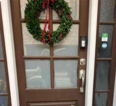 Purchased last week in store and placed on front porch door that has a 12 foot covering. It’s been 50-70 degrees everyday. Husband sends me this photo this morning when he was out the door for work. The wreath is melting the green coatings all over the door. Sad to have to return because the look is a 10/10, but I’ve never had a wreath or decorative item do this before!