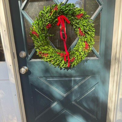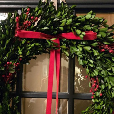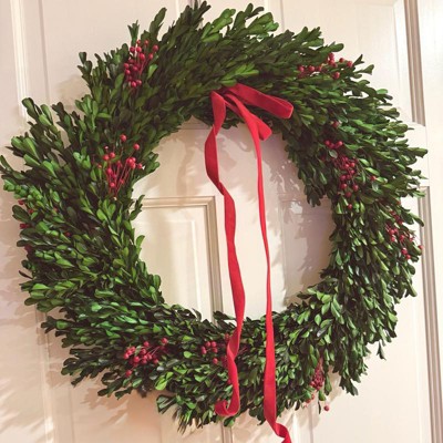 Highly recommend this Christmas Wreath, it is one of my favorite holiday decor purchases at Target this year. The wreath was neatly wrapped in a protective box with twine to maintain its shape and prevent damage, which I greatly appreciated as I ordered this item via pick up. The large-sized wreath is incredibly well-made, a bright color green (interspersed with some light green shades), and the velvet ribbon adds a nice festive touch. The boxwood leaves are carefully preserved providing a wonderful texture and also allows for this wreath to be enjoyed for years to come. Very happy with this purchase.