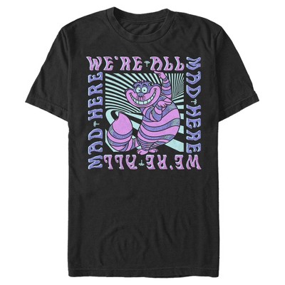 Hop down the rabbit hole and through Tulgey Wood to find your new officially licensed Disney Alice In Wonderland Cheshire Cat We're All Mad Here Tee! This Boys' Tee features the Cheshire Cat standing on his head framed by the words "We're All Mad Here." You'll be "Mad as a Hatter" if you skip out on this tee!