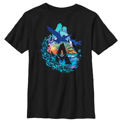 • Strut your stuff with this stylish new Boys' T-Shirt that is perfect for every occasion! Featuring the Avatar's logo with silhouettes of Jake Sully, Neytiri, ocean sea creatures, Great Leonopteryx, and a multicolored background.