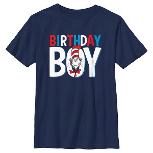 - Celebrate in true Seussical style with this new boys' t-shirt that is perfect for birthdays! Featuring the text: "Birthday Boy" in red, blue, and white lettering with the adorable Cat in the Hat adorning the word "Boy" across the front.