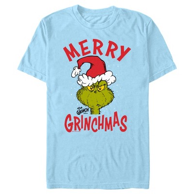 • If you're as cuddly as a cactus or as charming as an eel, then you'll love sporting this Grinch-inspired t-shirt! Featuring the Grinch wearing a Santa hat framed by snowflakes and the funny phrase "Merry Grinchmas" around him.