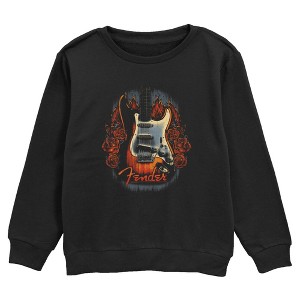 • What a special spring day you'll have with this stylish new boys' crewneck sweatshirt! Featuring a cool Stratocaster surrounded by vibrant red roses and flames, with the classic Fender logo printed in a unique retro style across the front.