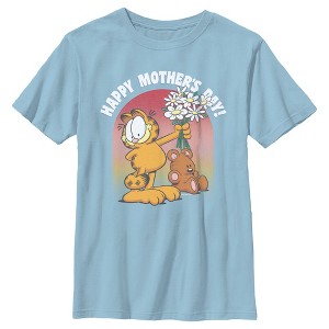 • Grab something special for this Mother's Day with this boys' t-shirt featuring a cute Garfield giving a bouquet of flowers with the phrase: "Happy Mother's Day" above him!