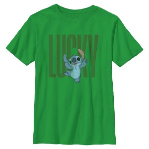 Get ready to sham-rock St. Patrick's Day in mischievous style with this officially licensed Lilo & Stitch boys' t-shirt! Featuring everyone’s favorite blue alien, Stitch, busting a move in front of bold, distressed "LUCKY" lettering, this tee brings the perfect mix of Irish charm and intergalactic chaos. With its festive green design, it's the ultimate go-to for parades, parties, and avoiding pesky pinches. Luck? With Stitch around, it’s more like controlled chaos!
