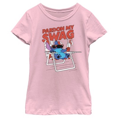 • Strut your stuff with this stylish new everyday Girls' T-Shirt that is perfect for every occasion! Featuring your favorite characters like Stitch relaxing and looking cool with sunglasses with the phrase "Pardon my Swag" printed in red.
