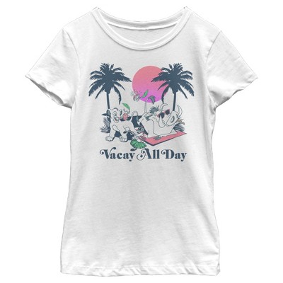 Hakuna Matata "ain't no passing craze," and neither is this officially licensed Disney The Lion King Vacay All Day Tee! This Boys' design features Simba with a beetle on his back, Pumbaa slurping up a juicy worm, and Timon hula dancing with "Vacay All Day" underneath them. Have no worries for the rest of your days, and rock your Lion King pride with this graphic tee!