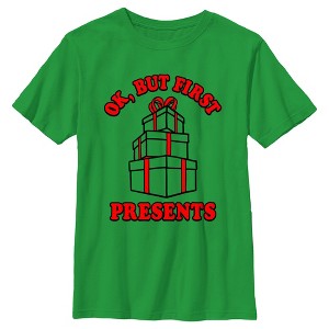 • Strut your stuff with this stylish new Christmas boys' t-shirt that is perfect for the holidays! Featuring a stack of Christmas gifts framed by the phrase: "Ok, but first presents" printed in red lettering across the front.