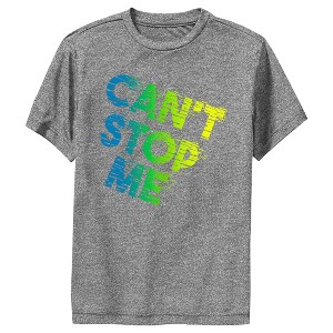 • Be the best with this stylish new boys' t-shirt perfect for your favorite sport! Featuring the phrase: "Can't stop me" printed ombre-style letters that fade from blue to green across the front.