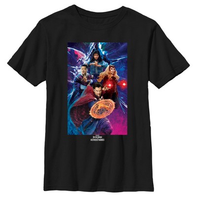 Join in the fight to save the world in this officially licensed design from Marvel's Doctor Strange in the Multiverse of Madness! This colorful boys' tee features a group shot of Doctor Strange, Wanda, Wong, and America Chavez in bright neon colors. Don't leave your heroes waiting in the wings and get this tee today!