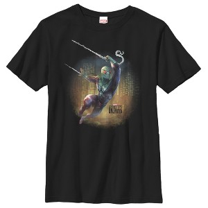 In this alternative reality, Bruce Banner becomes the Bullet Points Spider-Man on the Marvel Spider-Man Unlimited Bullet Points Black T-Shirt. This alternate Spider-Man is featured swinging with a cityscape behind him on this black Spider-Man shirt.