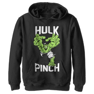 It's your lucky day because you've got an entire team of superheroes to make sure you don't get pinched with this awesome officially licensed Marvel St. Patrick's Day Pinching Hulk Boys' Hoodie. This festive hoodie features a graphic of the Incredible Hulk with his arms out and "Hulk Pinch" printed around him.
