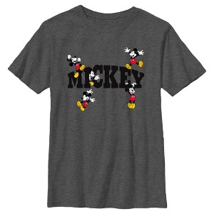 • Strut your stuff with this stylish new boys' t-shirt that is perfect for every occasion! Featuring "Mickey" written in varsity black lettering across the front, along with graphics of the friendly little mousey jumping, celebrating, and hanging around.
