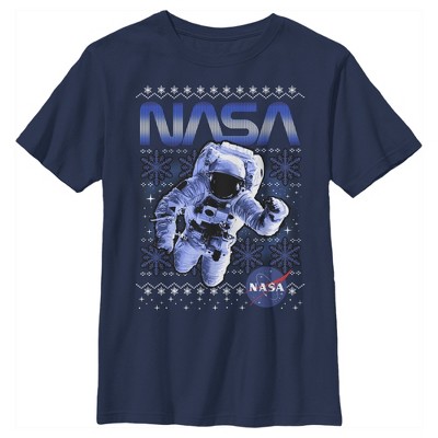 It doesn't matter what planet you live on because everyone in the galaxy can get in the Christmas spirit with the NASA Planet Ugly Christmas Sweater Print Boys' Tee. This fun NASA tee shows off the NASA logo, snowflake patterns, and planets in an ugly Christmas sweater style across the front.