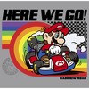 3...2...1... GO! Put the pedal to the metal and race for 1st place against other racers but beware, it might not be as easy as you think! Grab coins, use items and compete for the cup with your very own Mario Kart racing-style apparel! Featuring a cool drawing of Mario doing a cool drift on the colorful, fun, and amazing racetrack Rainbow Road with his iconic phrase "Here we go!" printed above in black!